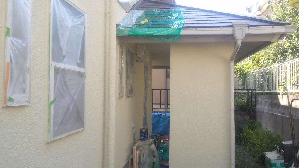 玄関ポーチの樋化粧カバー施工前状況。